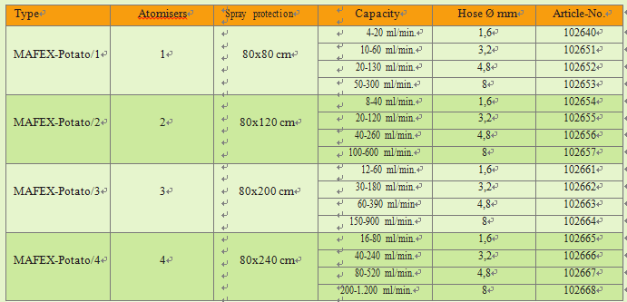 The MAFEX Potato and Fruit fine spray unit is based on ULV (Ultra Low Volume)technology, through which the required output volume can be reduced significantly thanks to optimal dispersion of active ingredients with uniform size of droplets.It has been used for many years, in particular for the optimal protection of potato harvest yield with germ inhibitors and fungicides, as well as for fruits with wax and fungicides.
